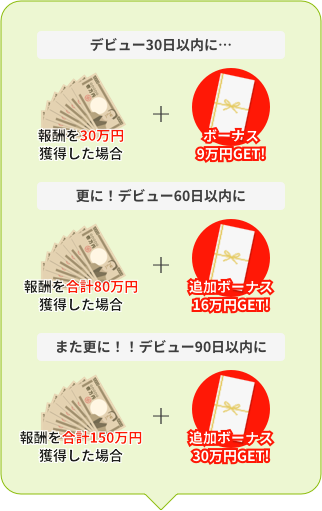 | 獲得金額 | 30日以内に達成 | 60日以内に達成 | 90日以内に達成 |